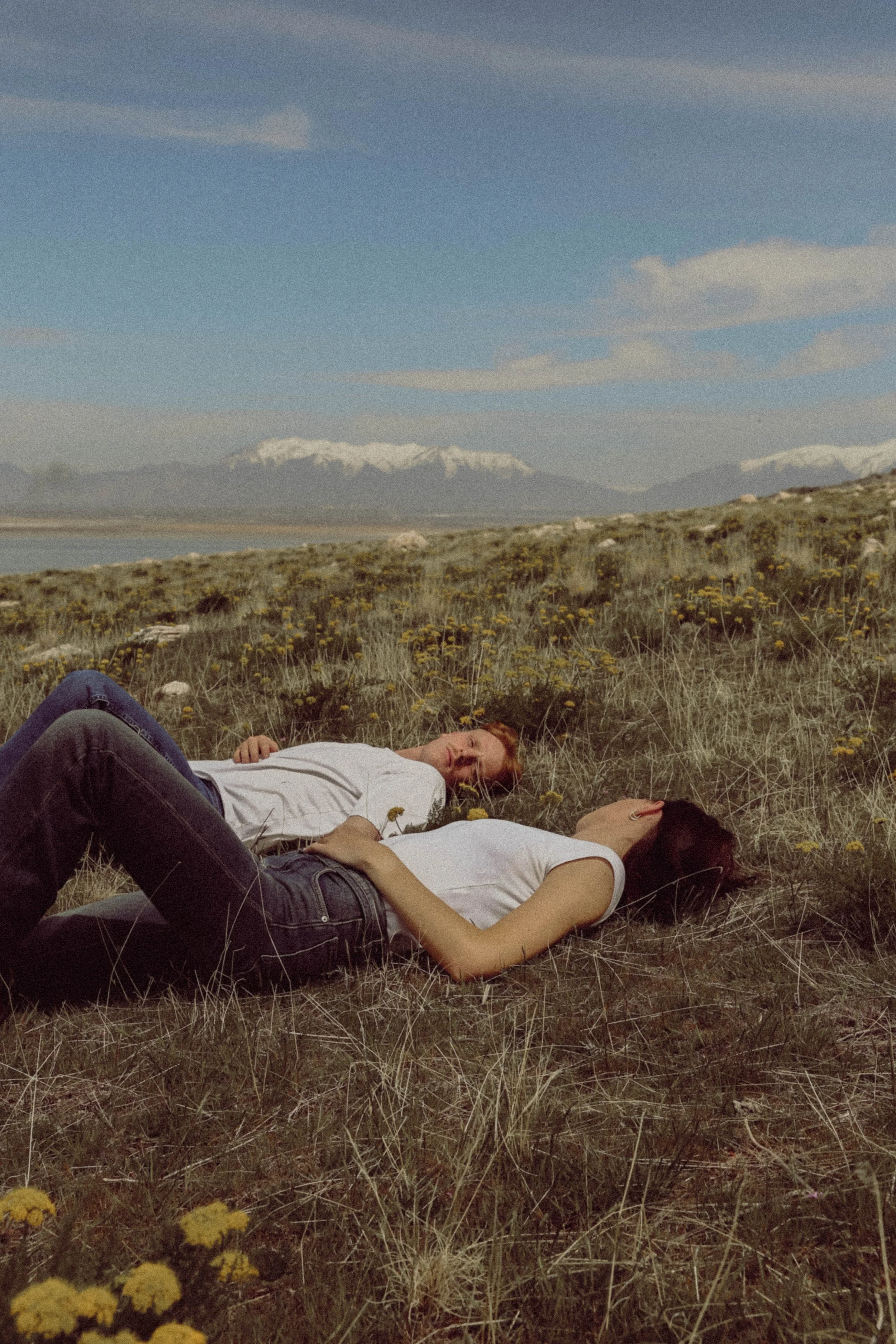 Two people lying on grass in a field with mountains in the background.