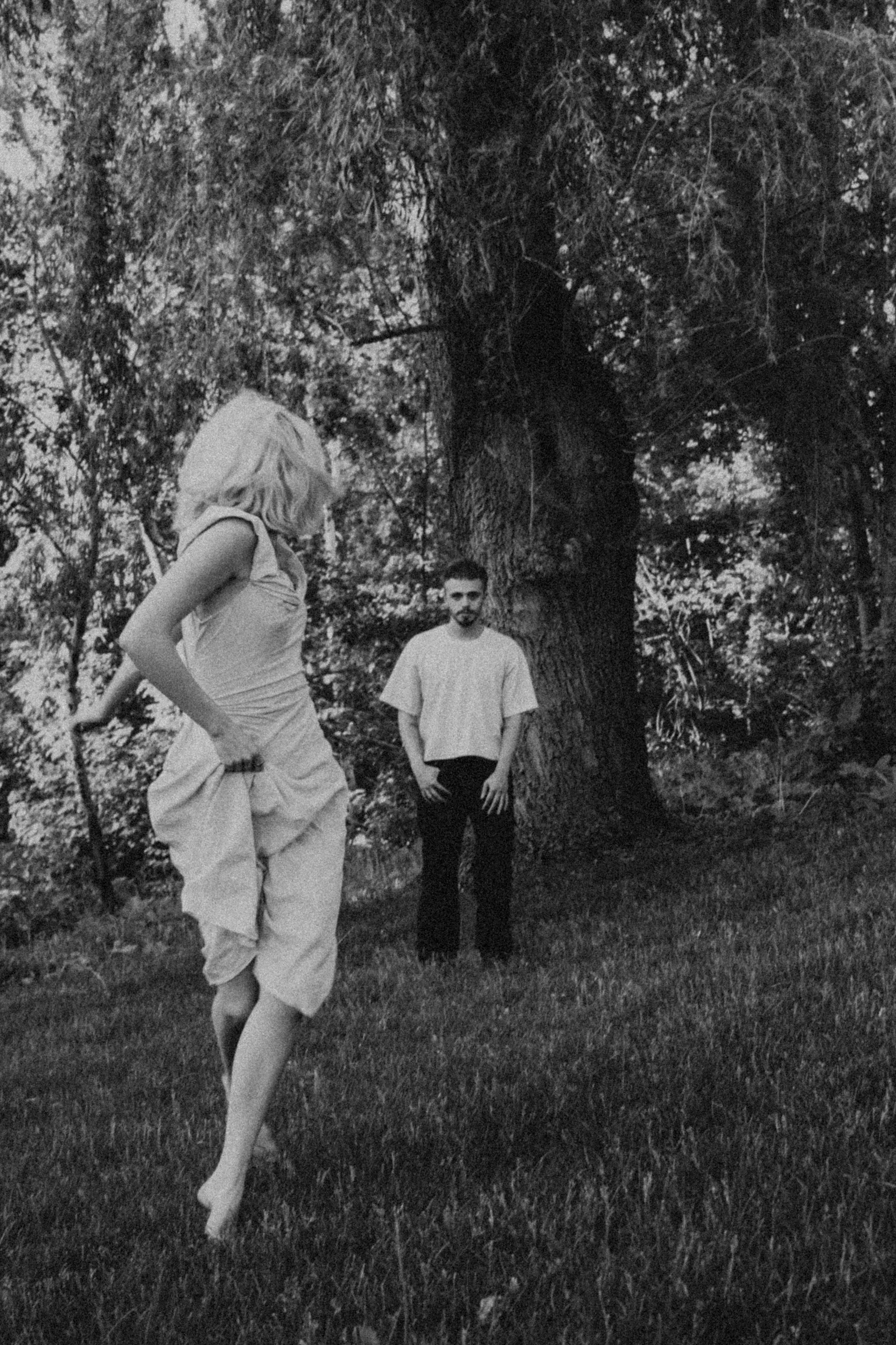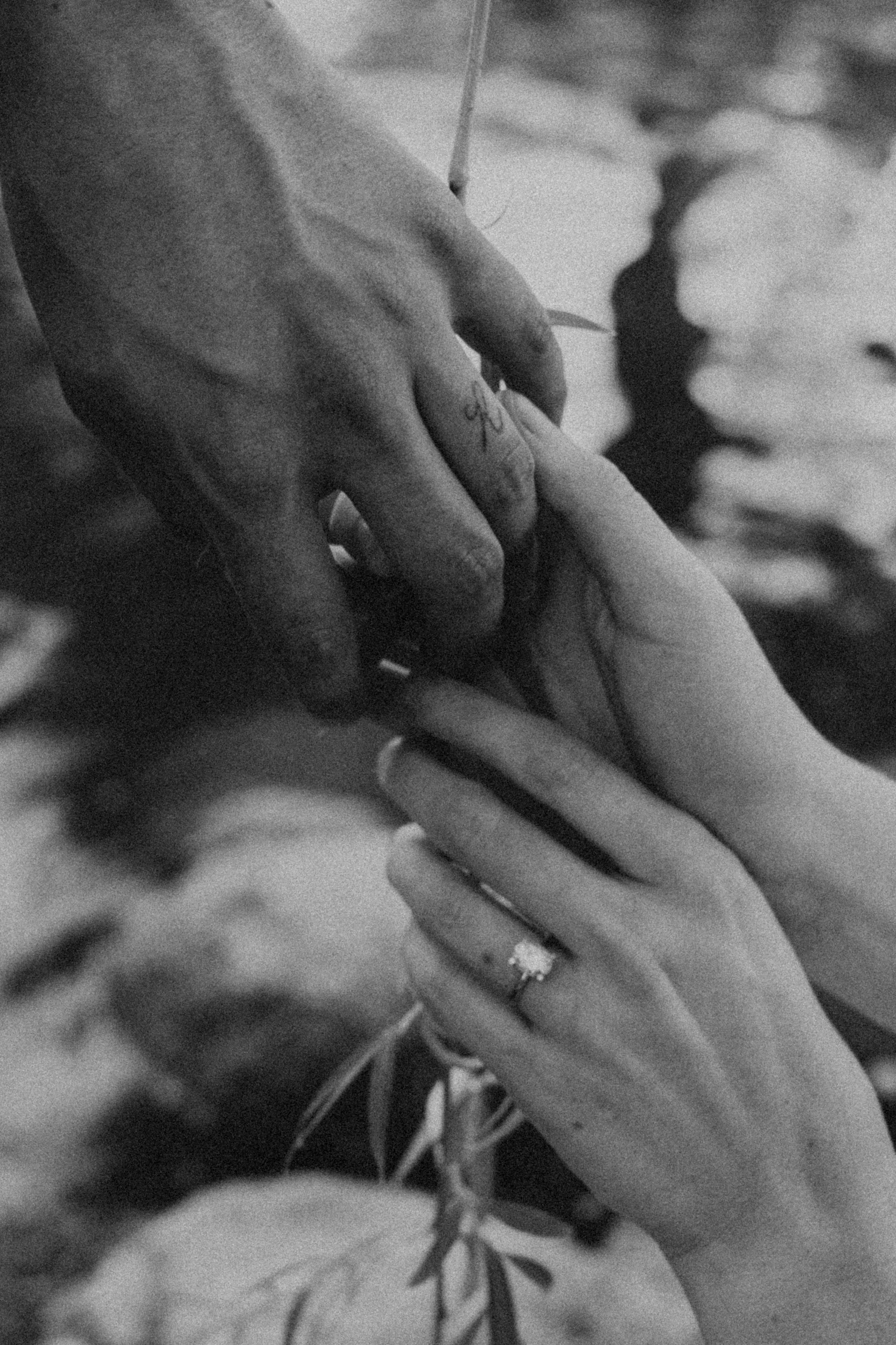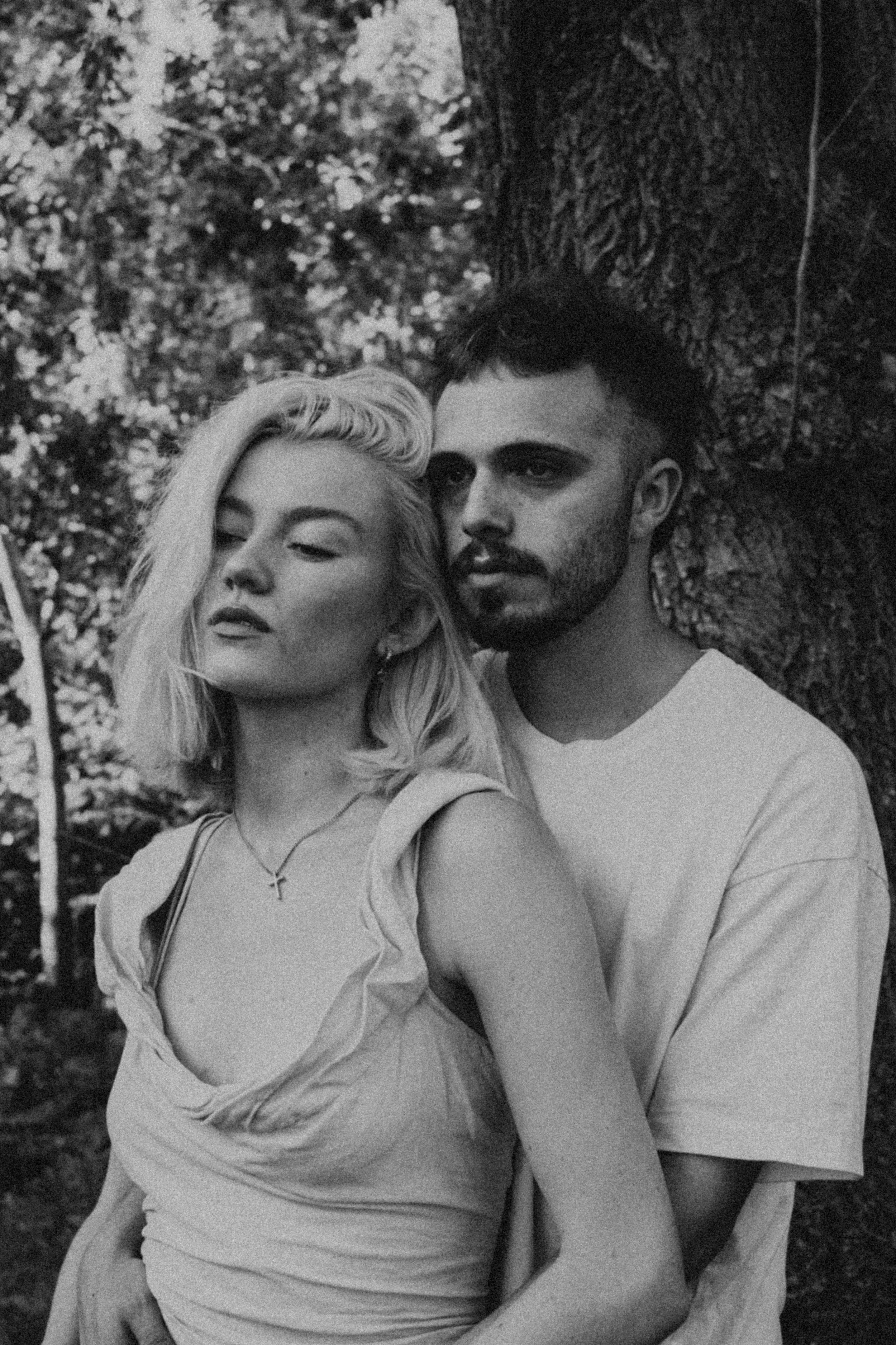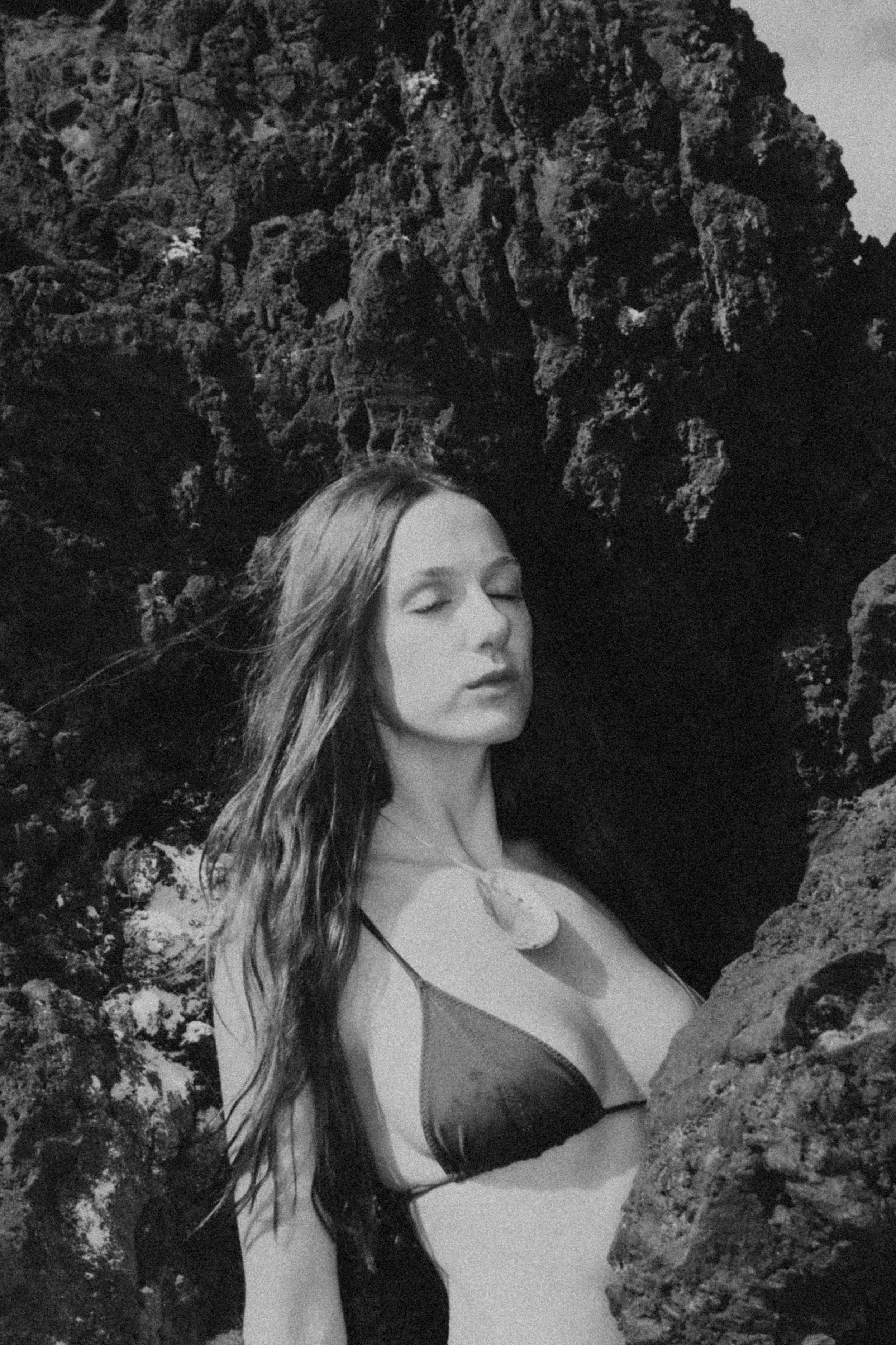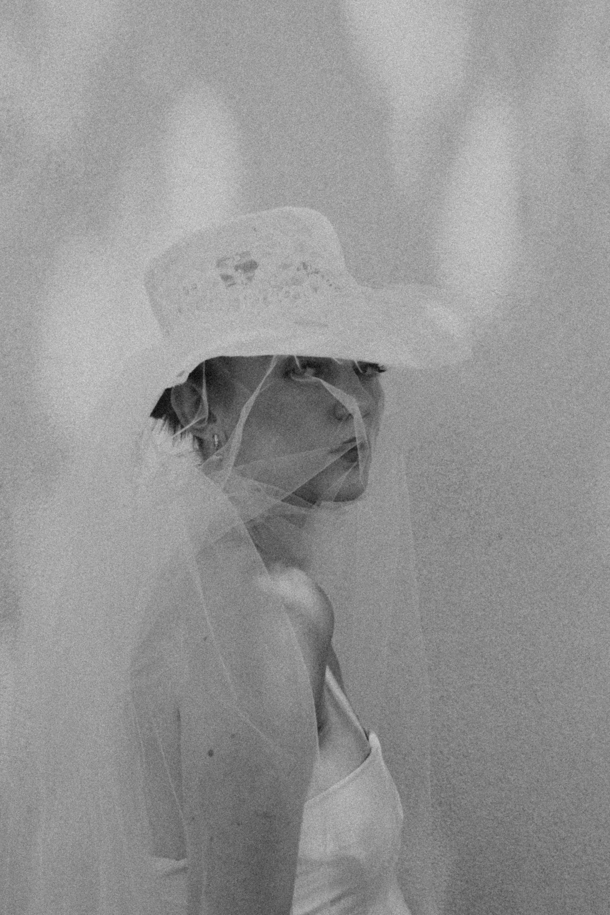 Black and white image of a person wearing a lace hat and veil, with a bare shoulder visible, captured in a soft, grainy style.