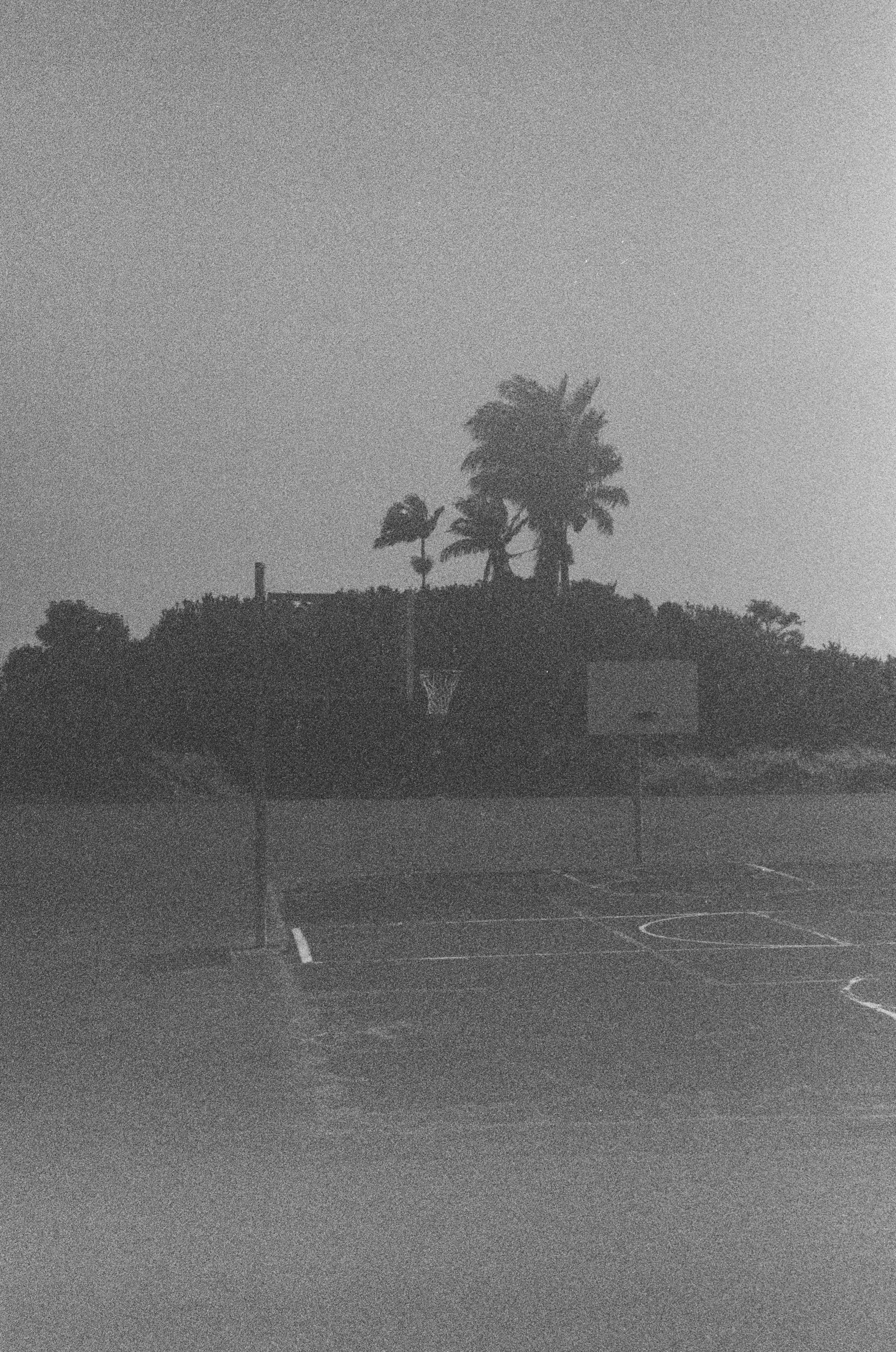 Grainy black and white photo of an outdoor basketball court with a hoop, surrounded by palm trees.