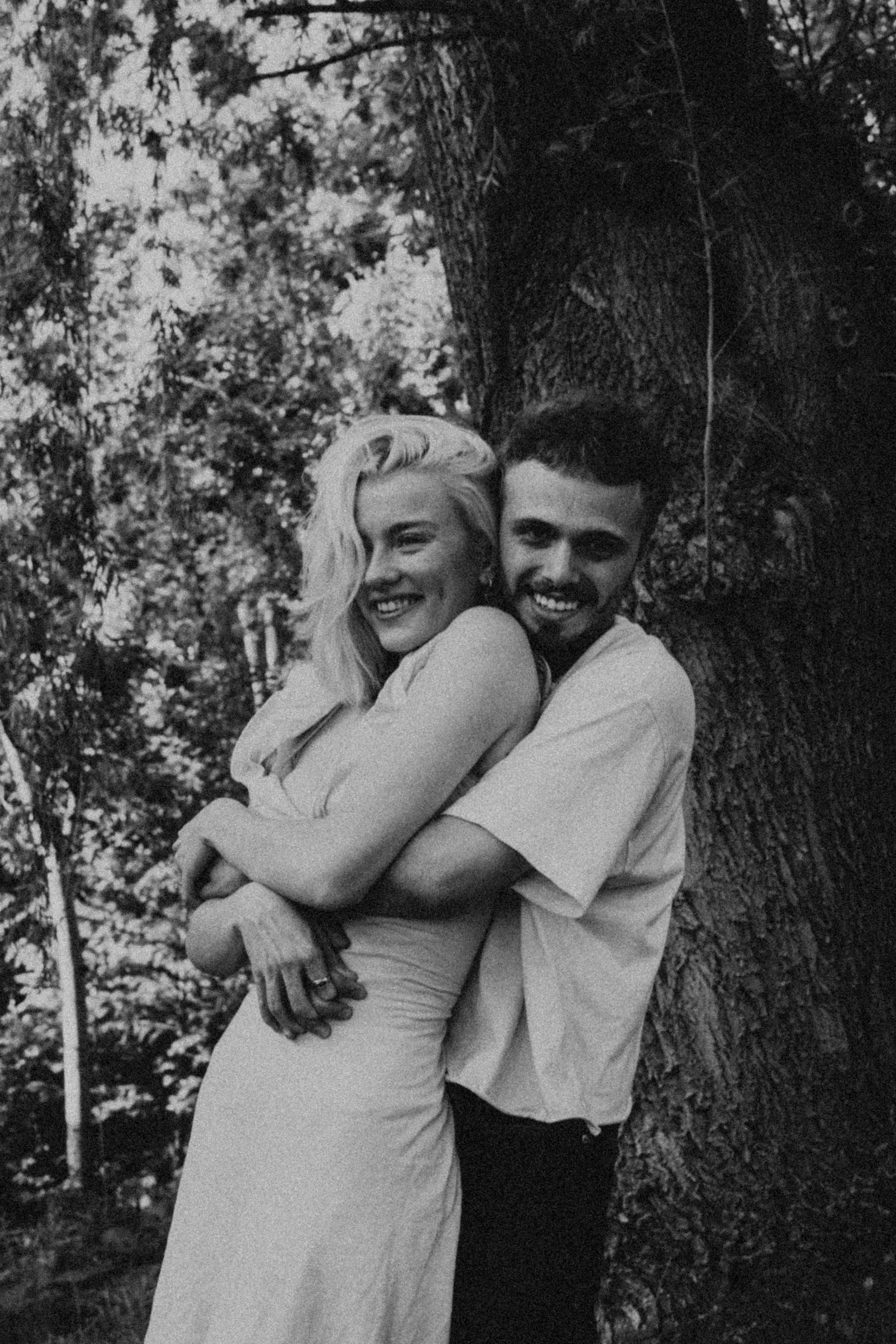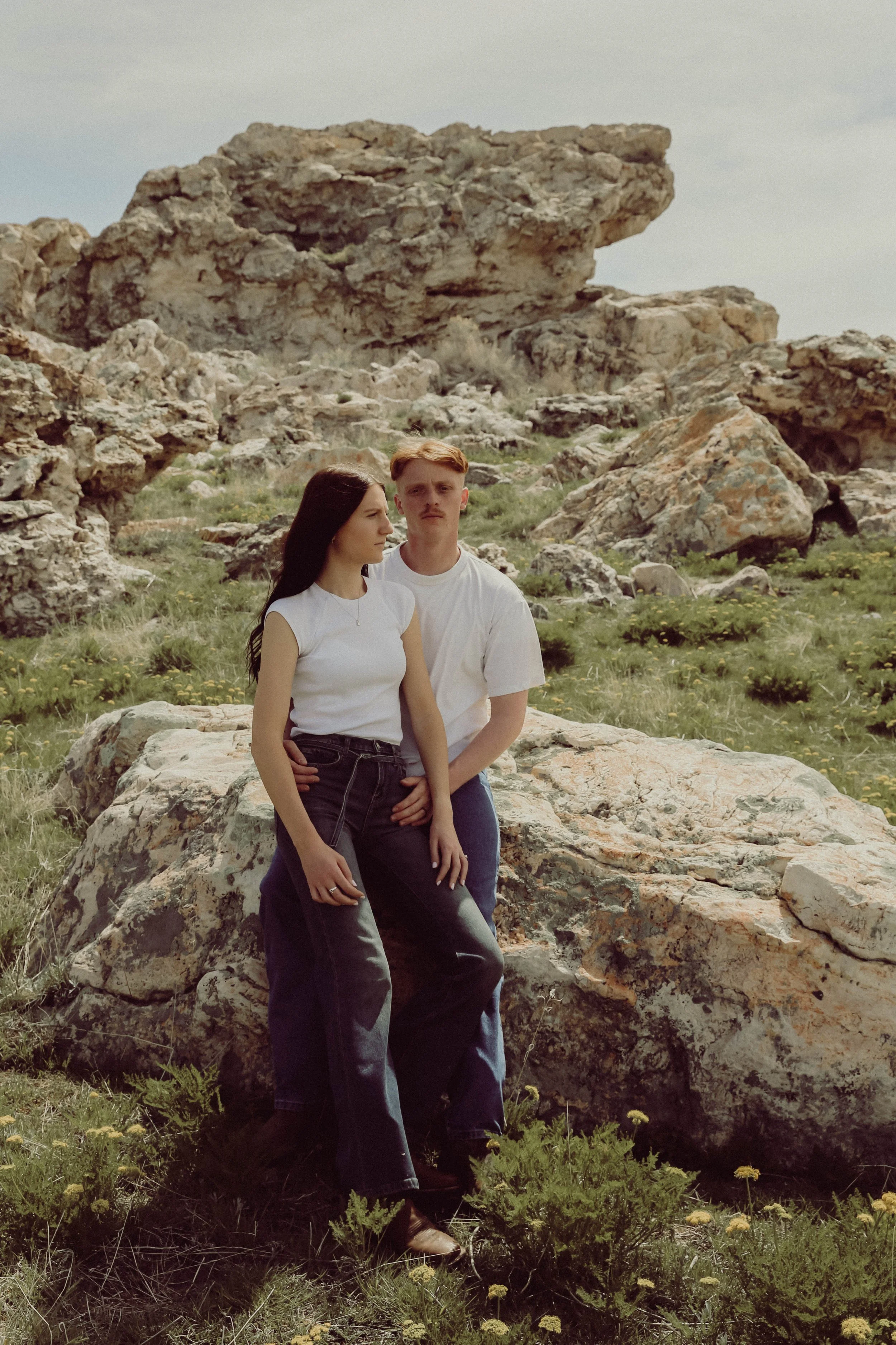 A couple posing together outdoors on rocky terrain, wearing casual white tops and jeans.
