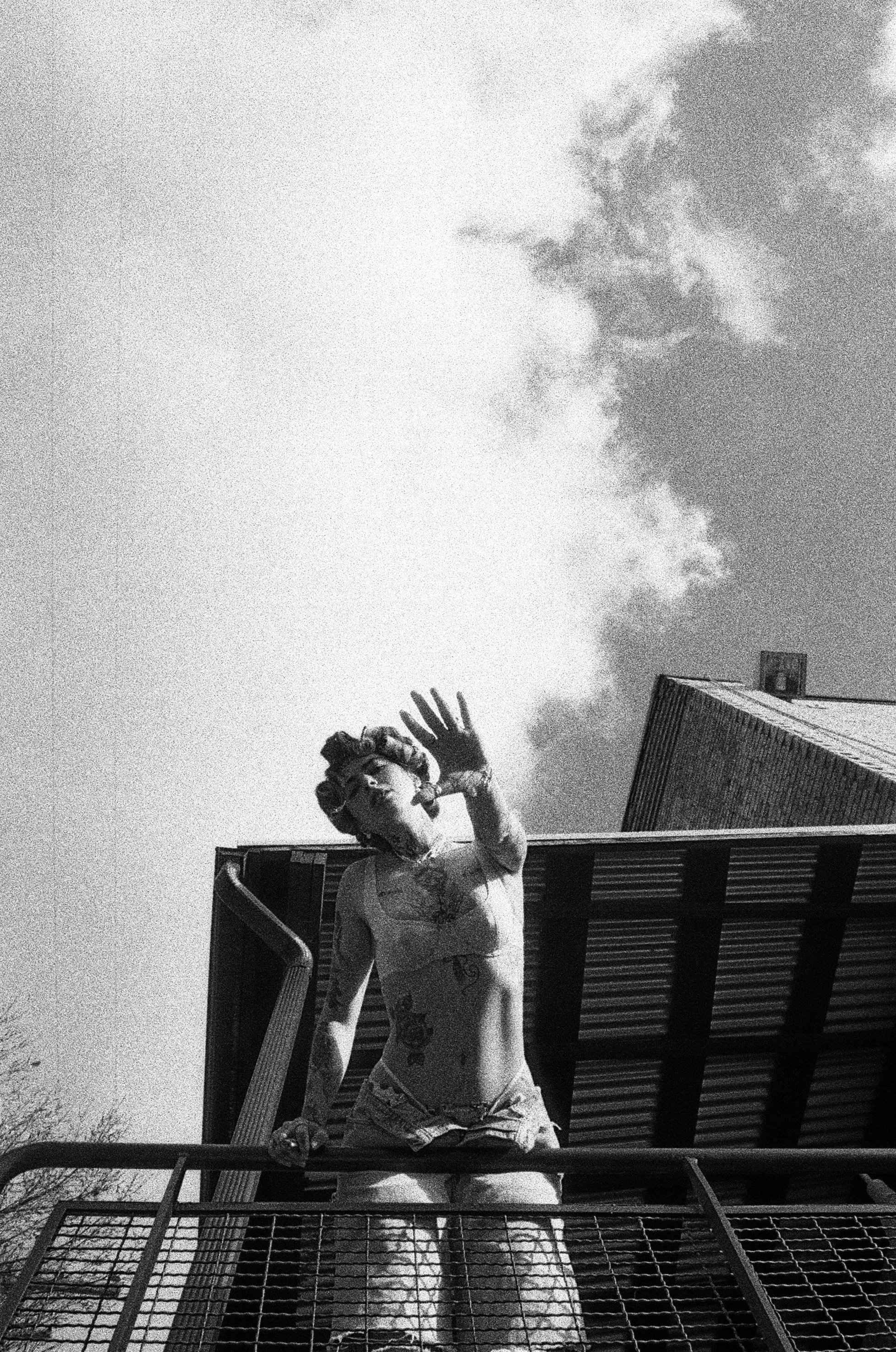 Black and white photo of a person with curlers in their hair, smoking a cigarette by a window, with tattoos visible on the neck and shoulder, wearing layered necklaces and a tank top.