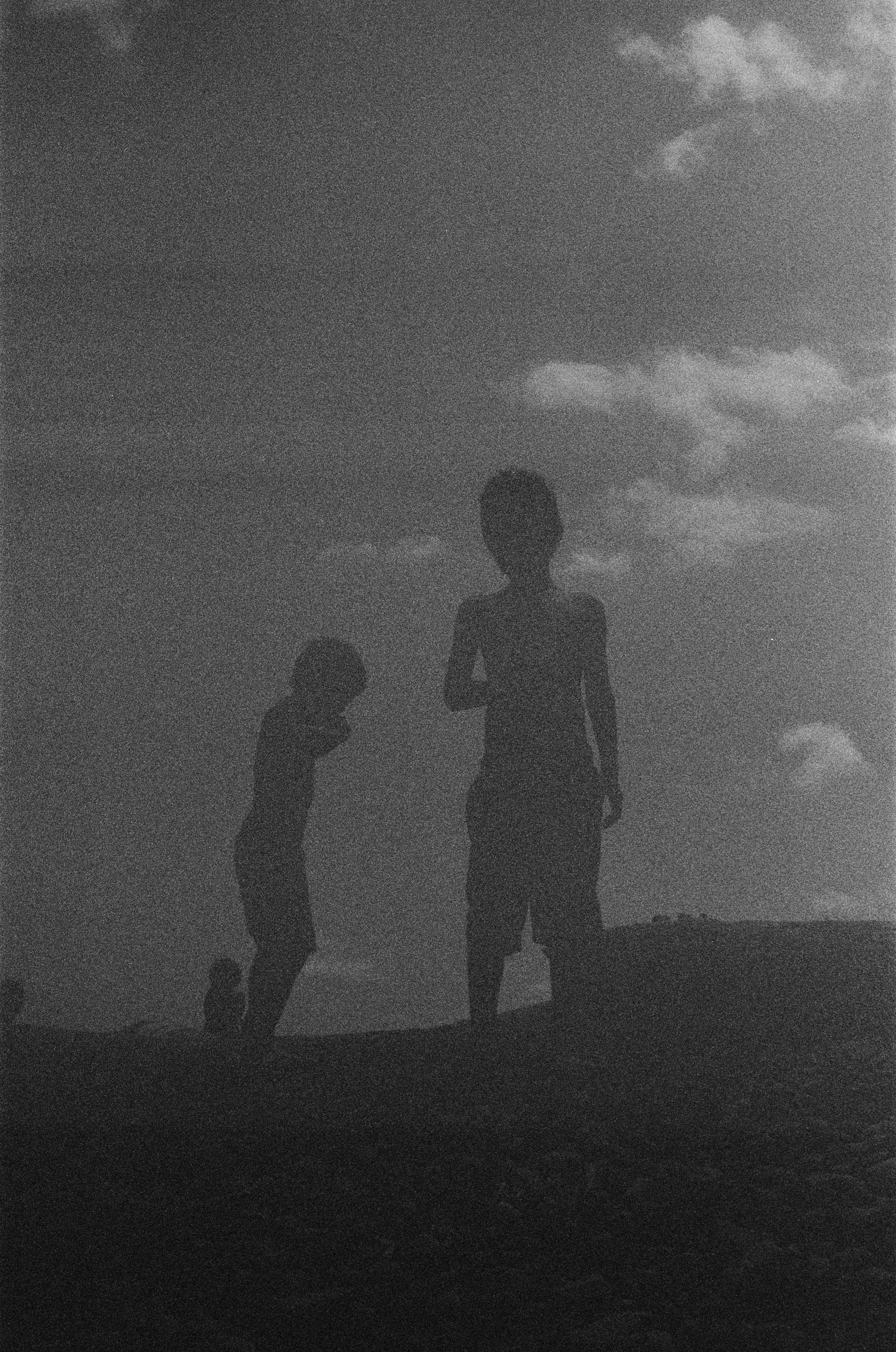 Two silhouettes of children standing outdoors, one leaning forward, under a cloudy sky.