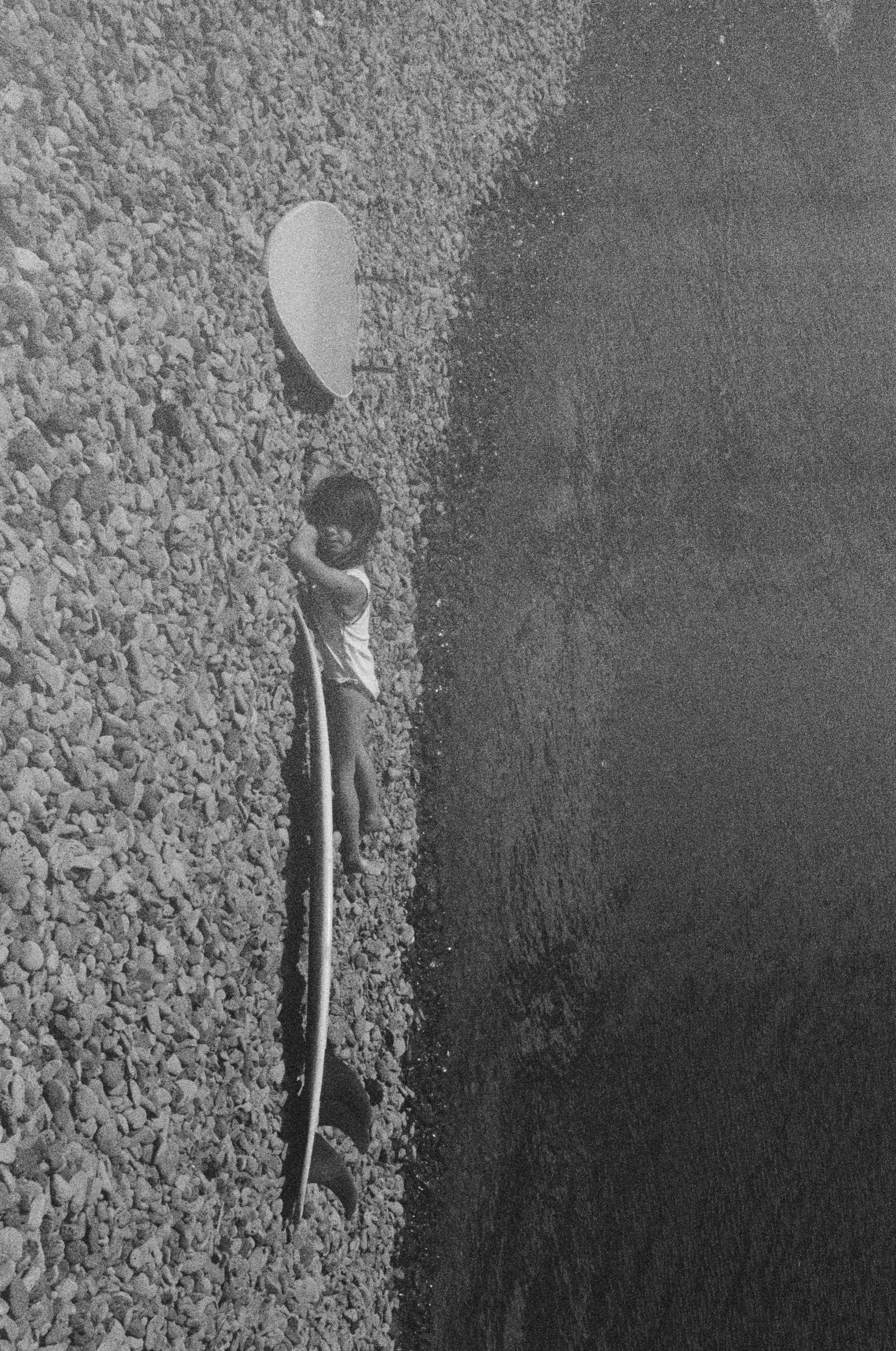 Young child on a rocky beach holding a surfboard, next to a water's edge, in black and white.