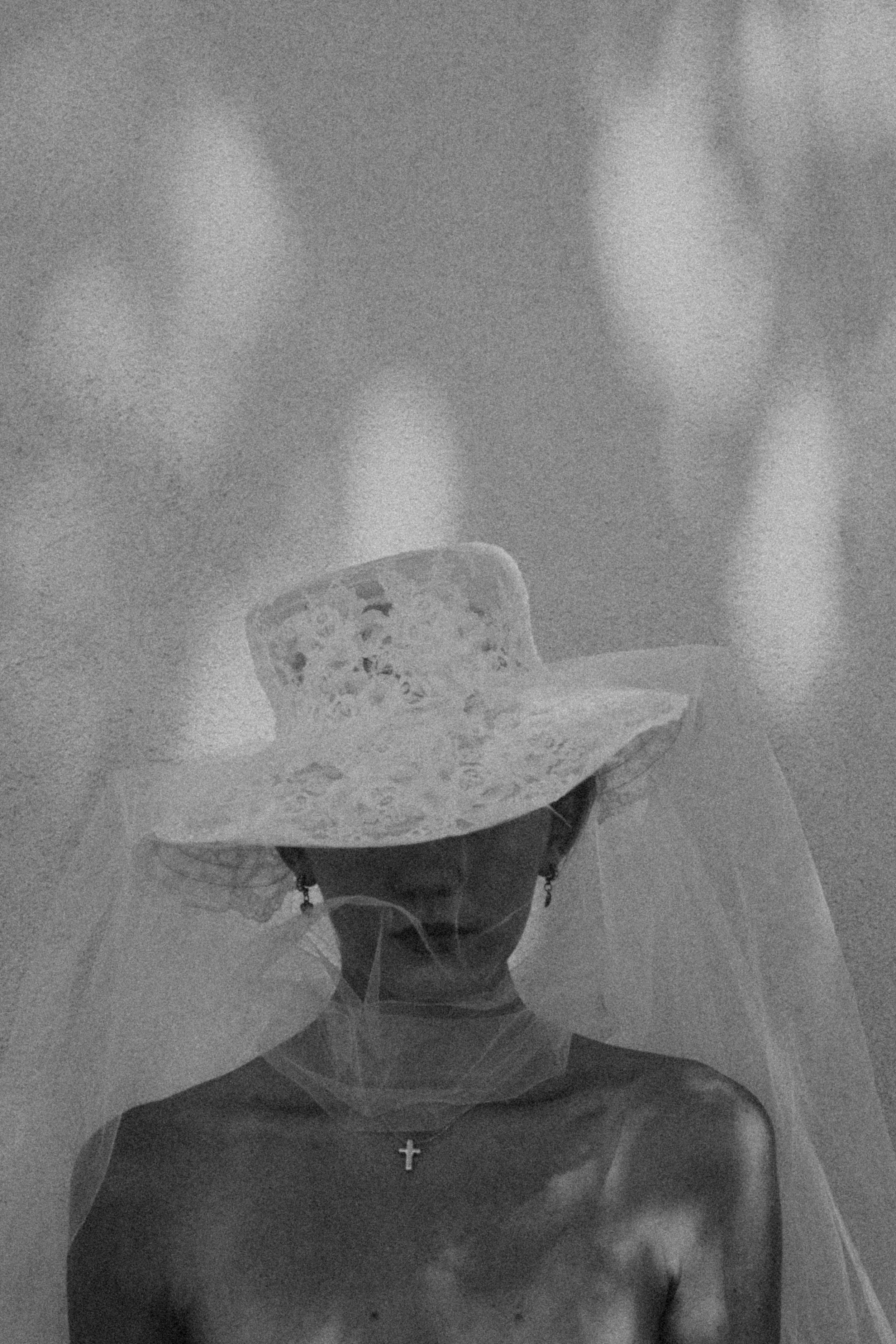 Black and white image of a person wearing a lace hat and veil, with a cross necklace, casting shadows on a textured background.