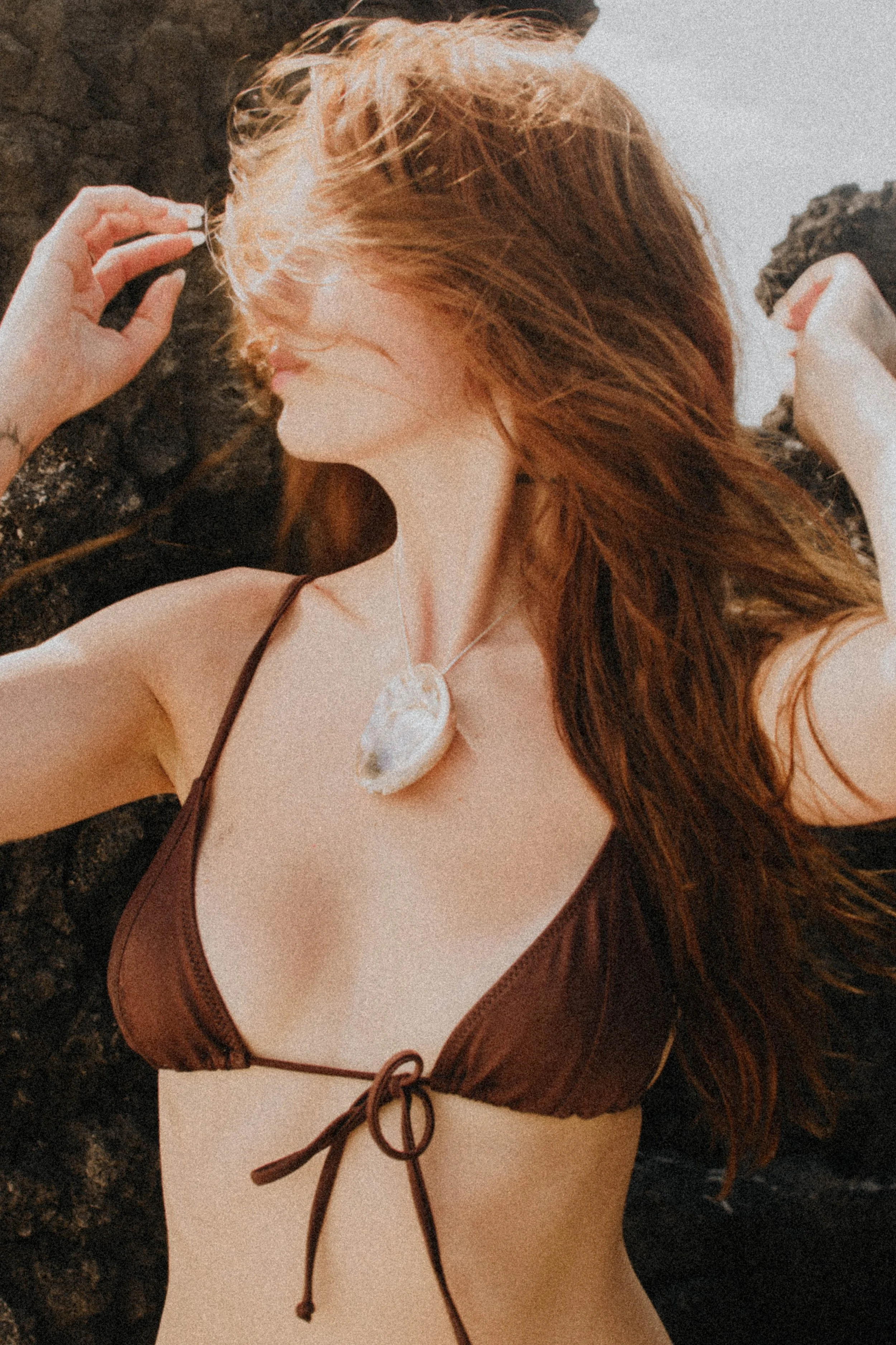 Woman in a checked bikini sitting on rocks by the ocean, with long red hair and sunglasses, under a sunny sky.