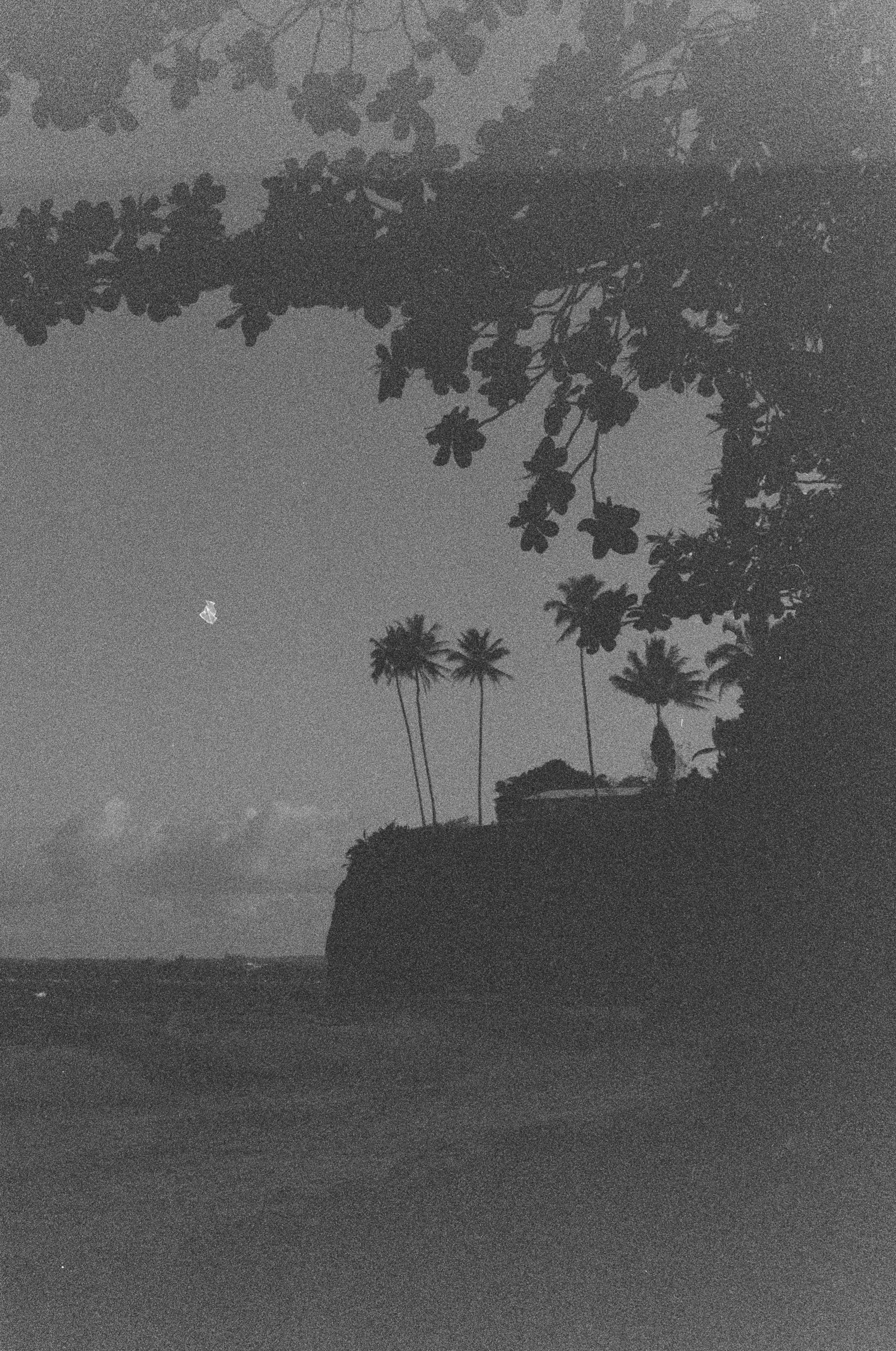 Black and white photo of palm trees on a coastal cliff, with overhanging leaves and cloudy sky.